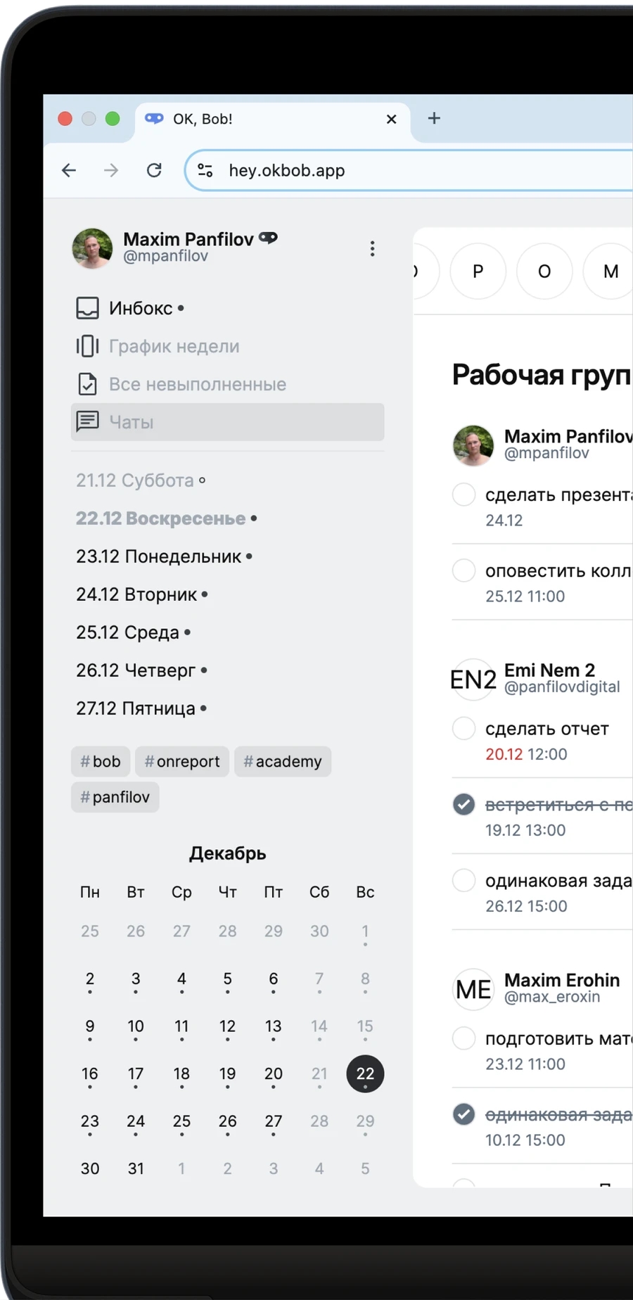Я пробовал Trello и другие мощные приложения, но большая часть моей работы проходит в Telegram, поэтому «OK, Bob!» идеально вписался в мой рабочий процесс. Мне нравится, что это легкий и удобный планировщик, доступный на любом устройстве