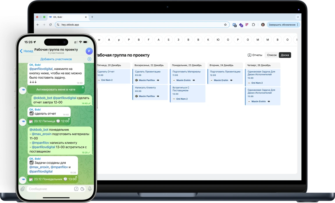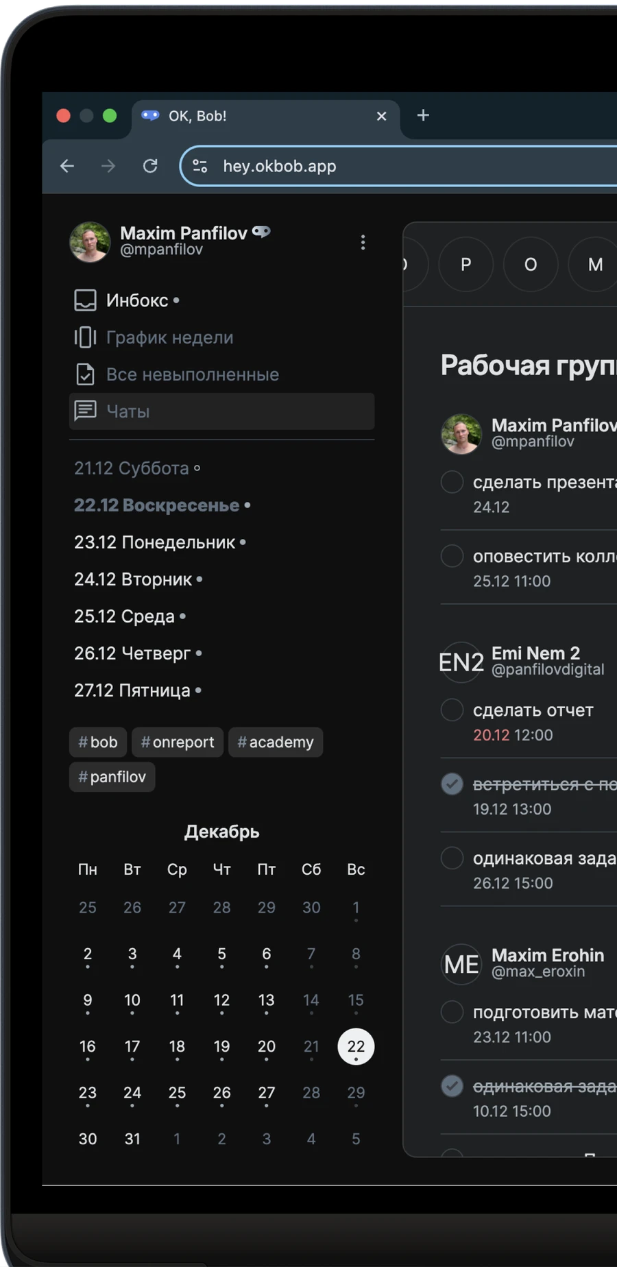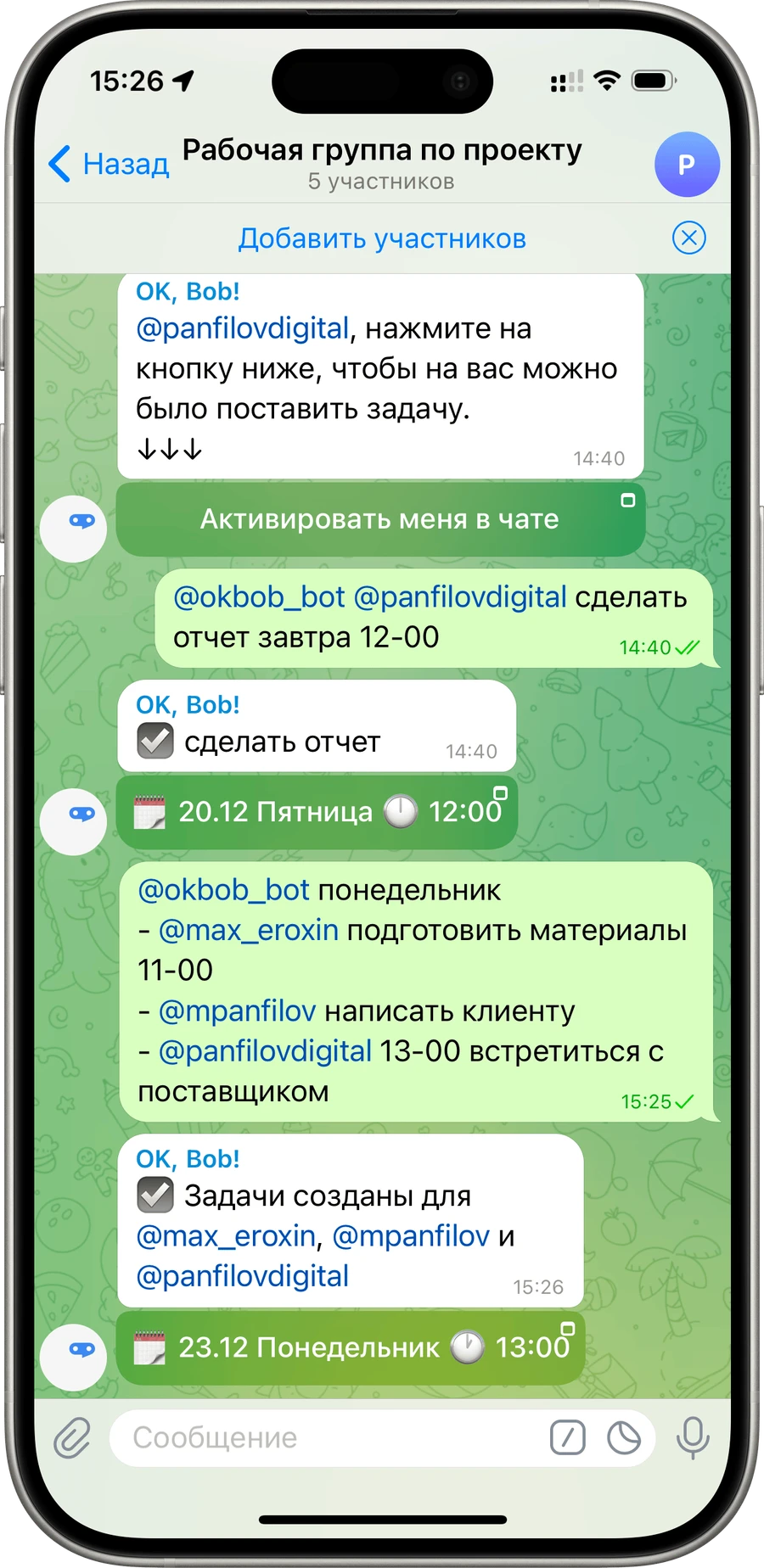 Я пробовал Trello и другие мощные приложения, но большая часть моей работы проходит в Telegram, поэтому «OK, Bob!» идеально вписался в мой рабочий процесс. Мне нравится, что это легкий и удобный планировщик, доступный на любом устройстве