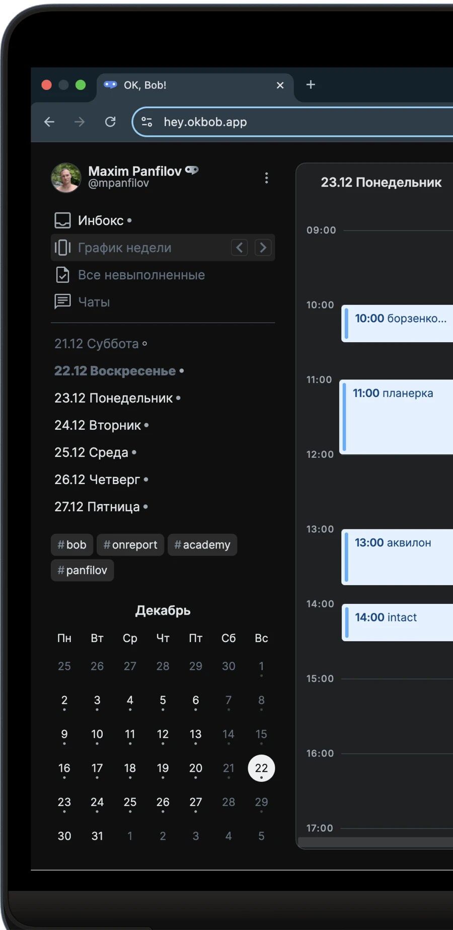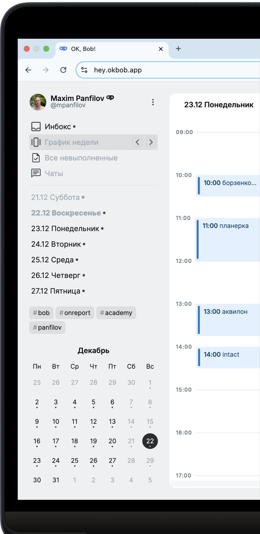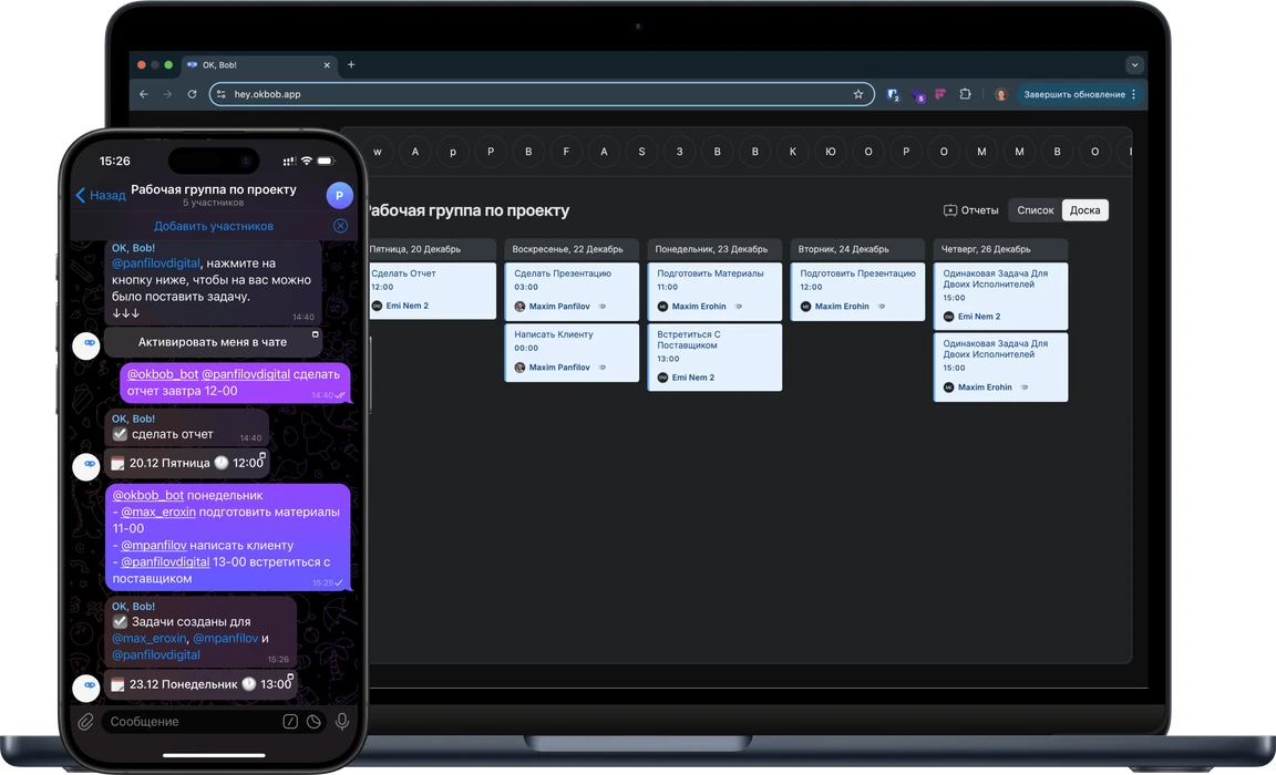 Я пробовал Trello и другие мощные приложения, но большая часть моей работы проходит в Telegram, поэтому «OK, Bob!» идеально вписался в мой рабочий процесс. Мне нравится, что это легкий и удобный планировщик, доступный на любом устройстве