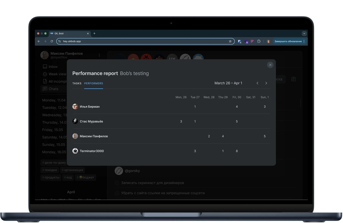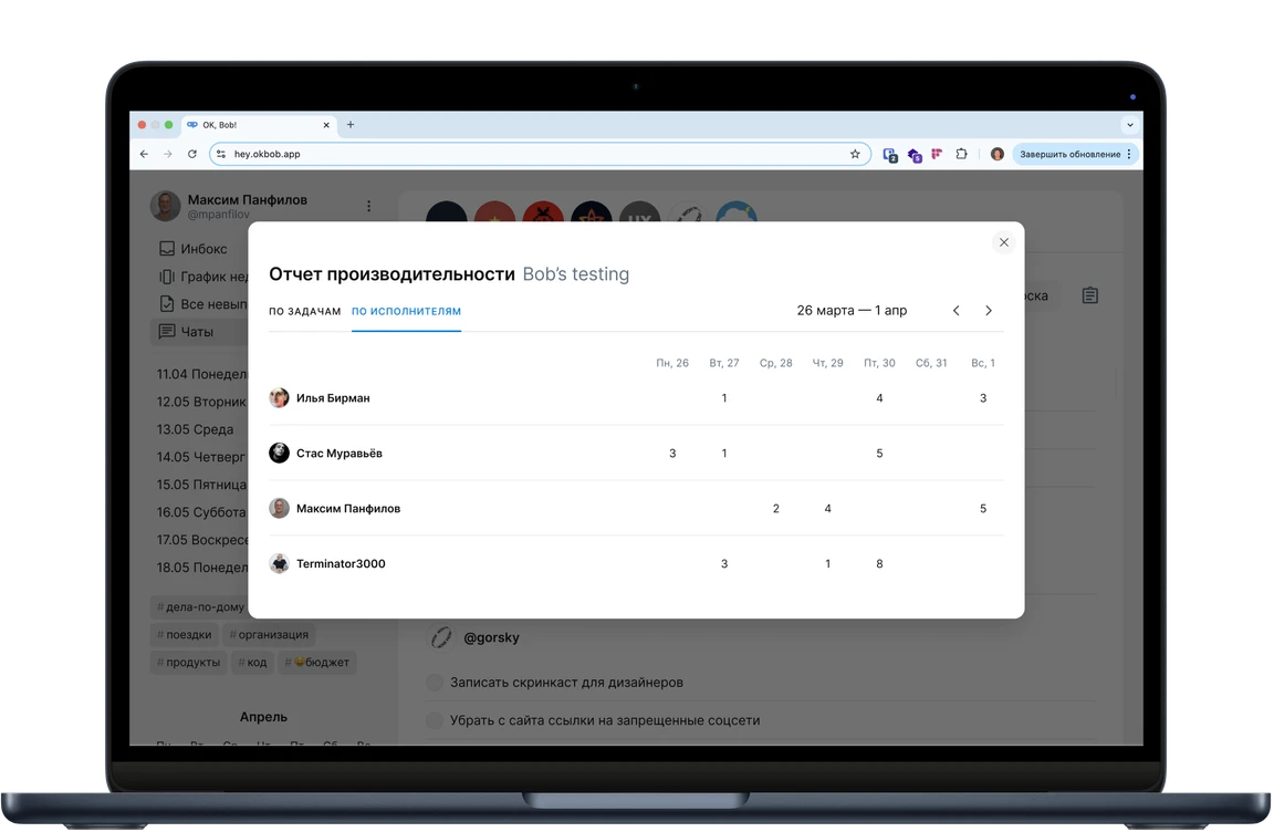 Выбрали «OK,Bob!» именно за его удобство. В нашей команде координатор проектов ставит задачи, а исполнители выполняют или переносят сроки в боте — это видно всем. Активных пользователей около 5 из 10, процесс простой и быстрый, без необходимости ввода логинов и паролей