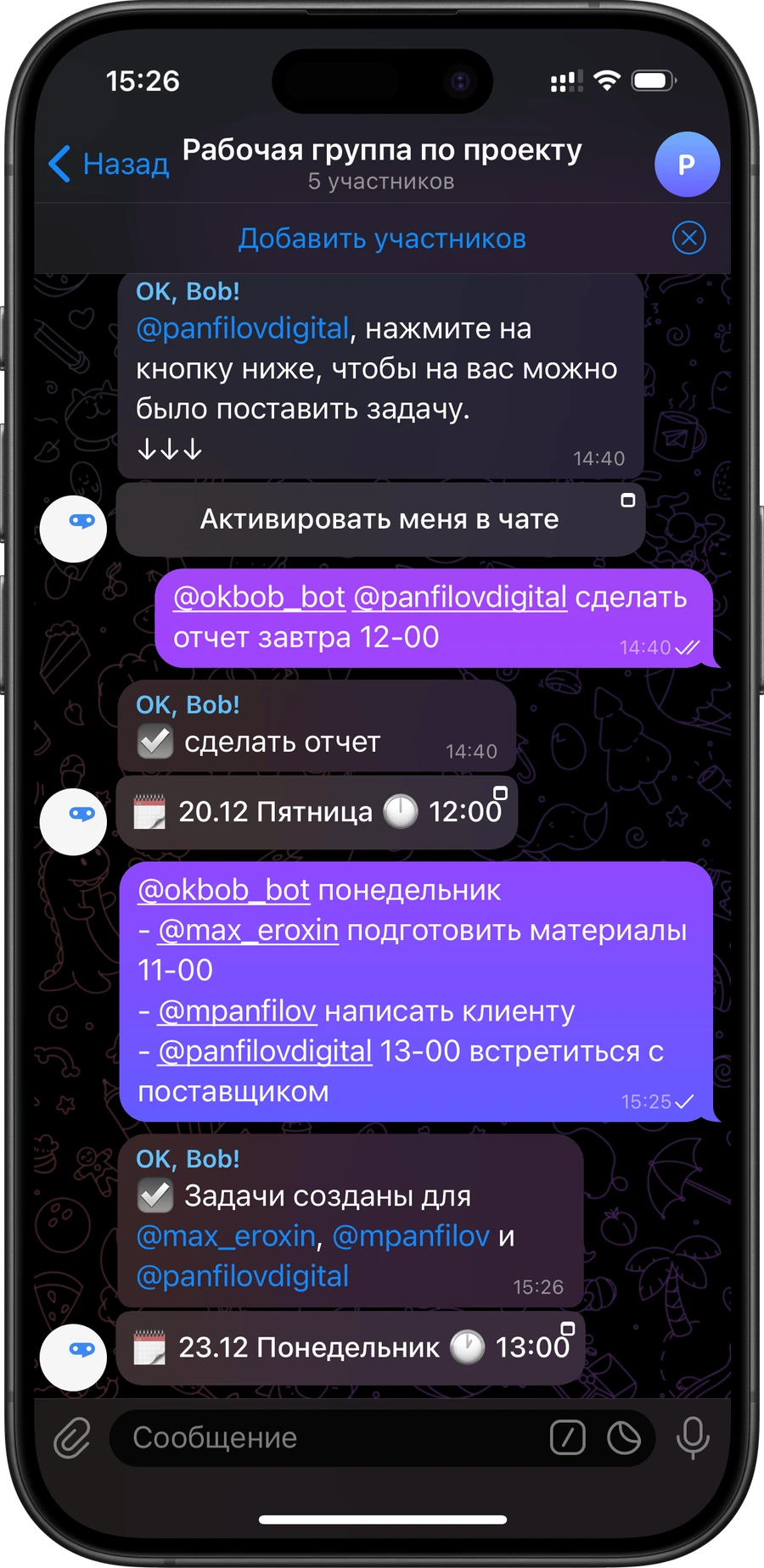 После долгих поисков удобного задачника в Telegram остановилась на «OK, Bob!». Теперь все мои коллеги видят и подтверждают выполнение задач в общем чате. В нашей компании несколько рабочих групп, в каждой от 3 до 10 человек, и сервис идеально подходит для организации работы в них