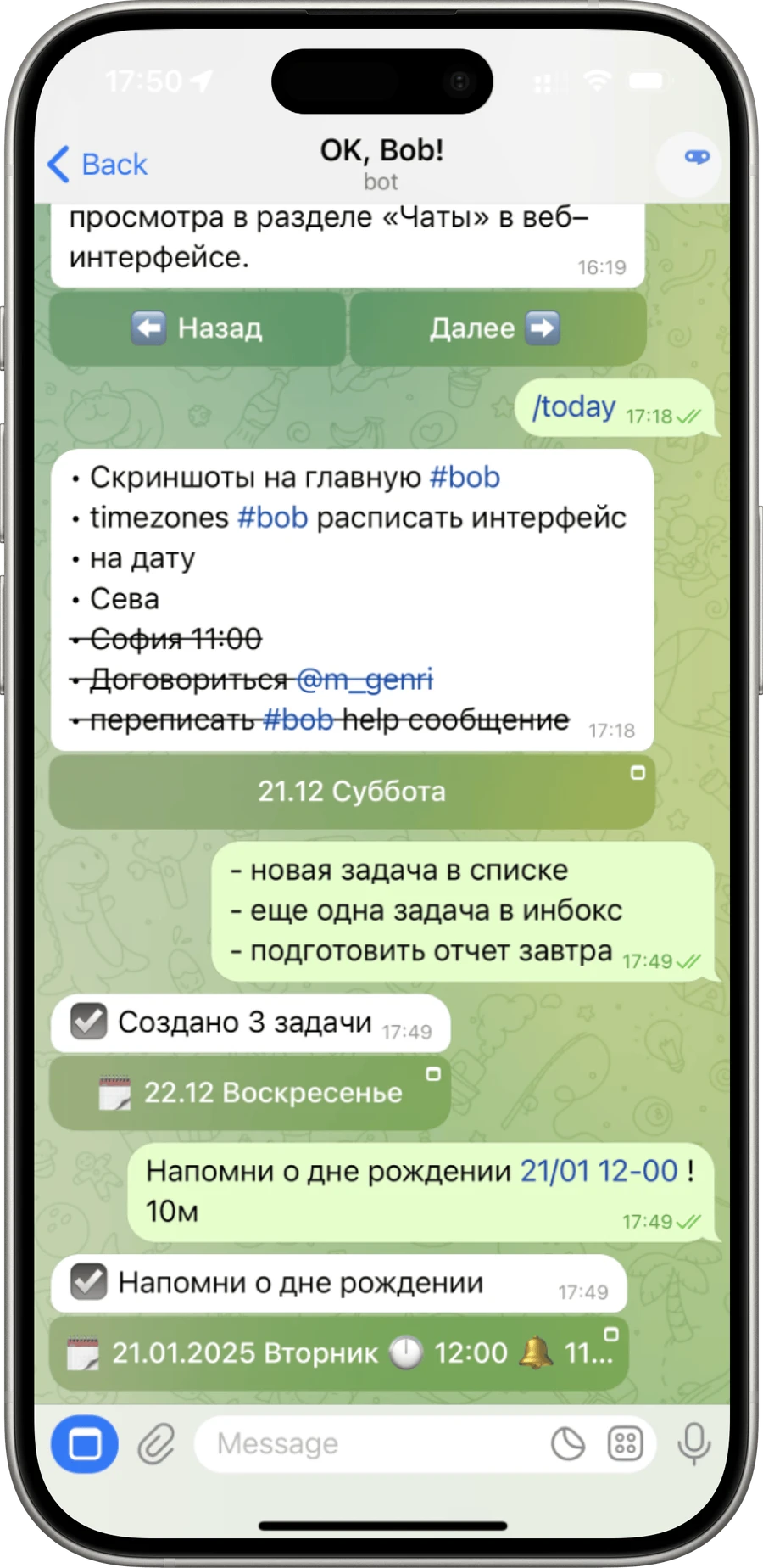 Позвольте себе не помнить. Отправьте в чат-бот дела или идеи пока вы на ходу, в транспорте или на совещании – все сохранится. Если надо, Боб напомнит.