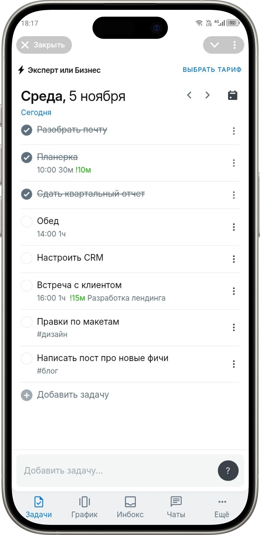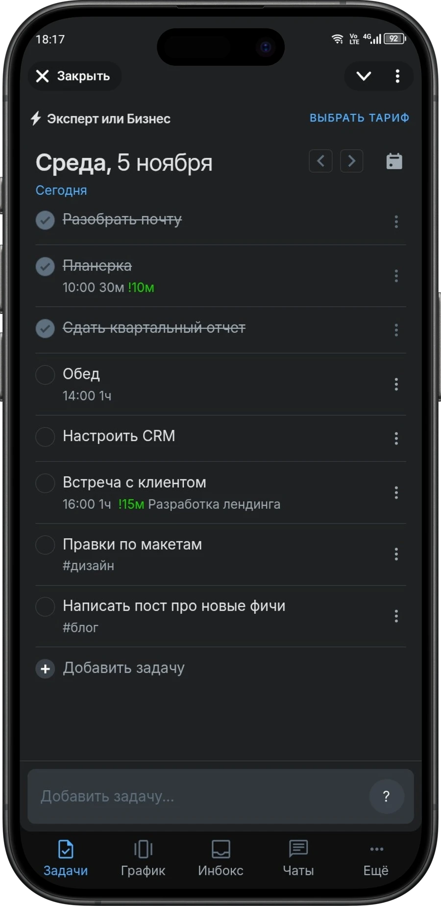 Меньше хаоса и больше порядка. Планируйте день, двигайте задачи по времени и дням, устанавливайте напоминания.